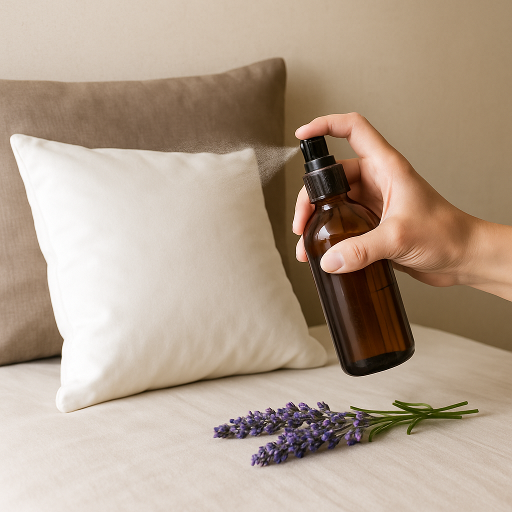 Přidejte 10 kapek směsi do lahvičky s 200 ml vody, protřepejte a lehce nastříkejte na polštář. Vůně vám usnadní usínání a zlepší kvalitu spánku.